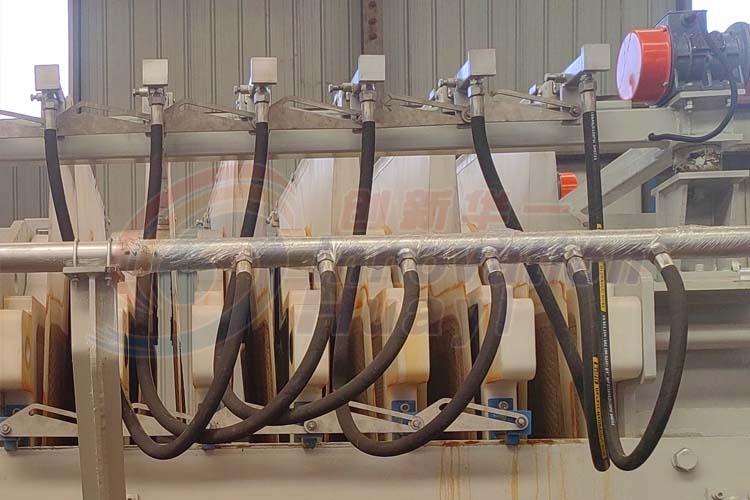 4、濾板開啟: 在擠壓過程結束后,釋放壓緊油缸的壓力拉開濾板。