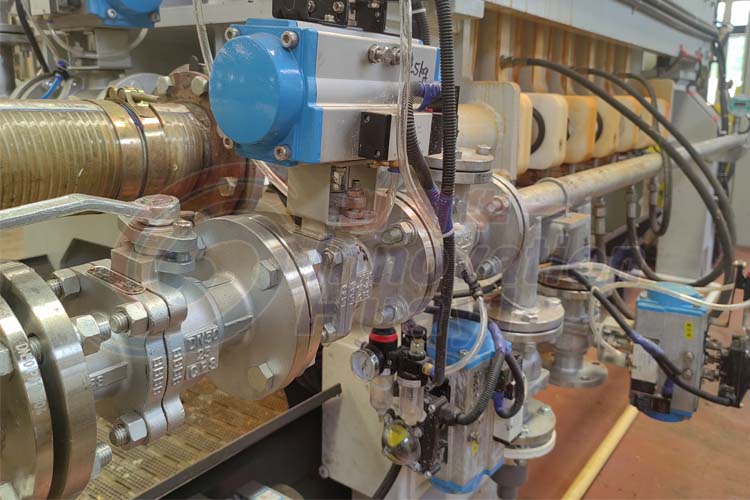 2、過濾 濃縮污泥通過上部進料系統進入每個慮室。濾液從濾布濾出并通過每塊板的排水孔排出。每個慮室填滿預定量的污泥,進料結束。